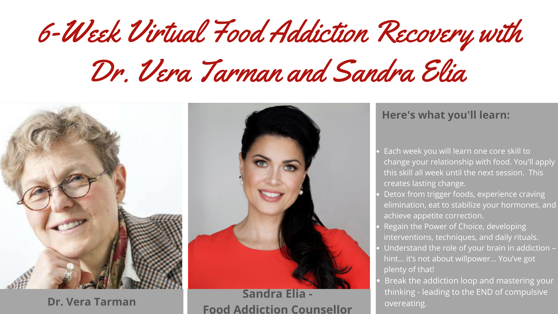 Join Sandra Elia and Dr. Vera Tarman for the Food Addiction Recovery program - Cost $247